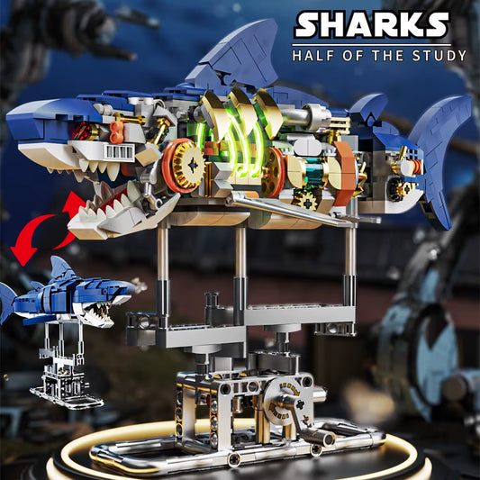 Mechanical Shark Building Set, Shark Sea Life Building Blocks Set with Display Stand and Lights, Block Gift for Kids and Adults
